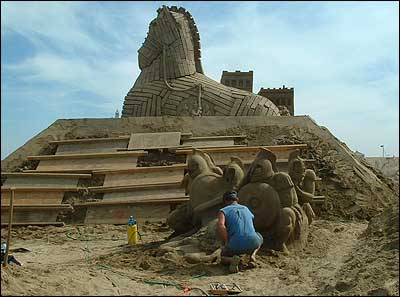 Песочные фигуры делают из специального речного песка с повышенным содержанием глины, а затем для устойчивости покрывают специальным закрепляющим раствором. Такие песочные замки и скульптуры могут простоять несколько месяцев, выдерживая напор ветра и дождя.